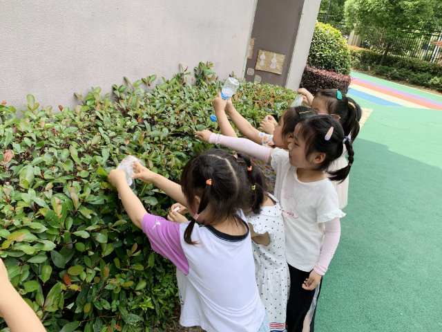 活动开始了,孩子们通过闻一闻,摸一摸,了解了水的特性无色无味透明,摸起来凉凉的、很舒服。在跟水的互动中,亮亮说:“水好像会从手指缝里逃跑耶!”是啊,水看得见摸得着却抓不到。 那怎样才能将水运走呢?通过探索,孩子们了解到海绵和毛巾放在水里可以吸水,但是他们的“肚子”比较小,运的时候会漏水,矿泉水瓶的口比较小但是身体比较大可以装很多水。有洞和有缝隙的工具不便于运水,水会从洞和缝隙里流走。最后,孩子们自由选择工具运水给校园里的植物们浇浇水!通过探索和游戏,孩子们深刻体会到水是液体和具有流动性的特点。