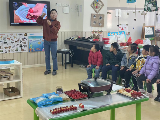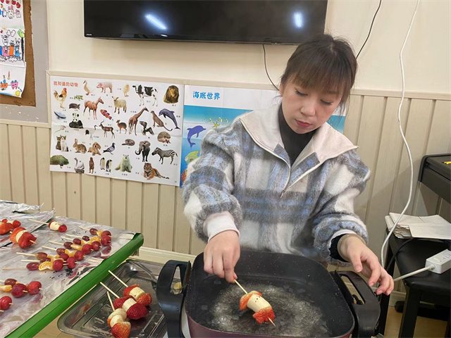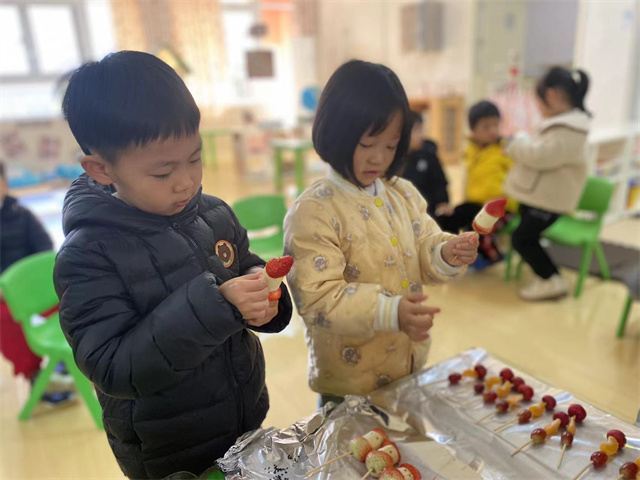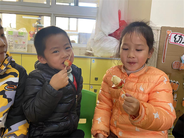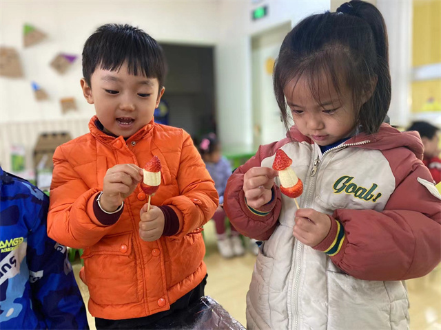 冰糖葫芦作为传统小吃,有孩子们喜欢的酸酸甜甜的美味,而中西结合的“圣诞糖葫芦”则充满了创造性和无限可能,同时也让孩子们感受到中国传统小吃与西方文化的碰撞,在孩子们幼小的心灵里种下融合与创造的种子。
