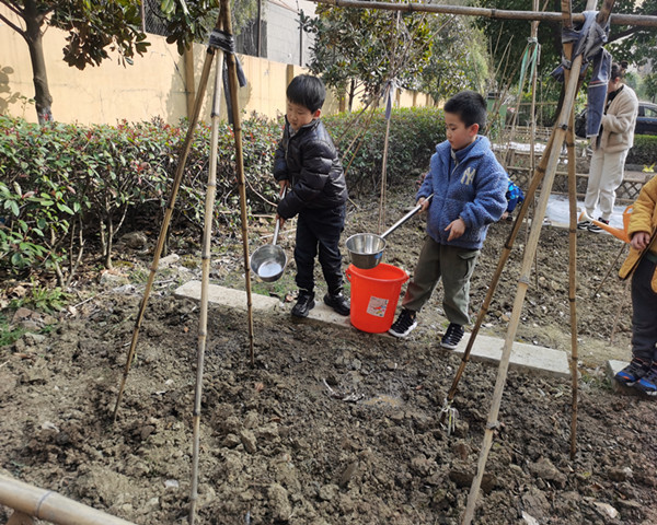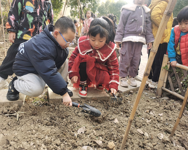 春天到了,我们的小菜园可以种哪些菜呢?前期孩子们展开了热烈地讨论。涵涵说:“我们种一些生菜吧 。”欣宇说:“这个主意真好,正好我家里有一些生菜的种子。”梓墨说:“我家里有番茄种子,一起种可以让我们的小菜园更漂亮。”孩子们说做就做,今天就带来了蔬菜种子。种植活动开始了,瞧,孩子们来到小菜园,翻地、施肥、撒种子、浇水,相互合作,忙得不亦乐乎。孩子们专注地劳动,用期待的眼神望着自己种下的蔬菜种子,跟农民伯伯春耕完期待庄稼有好收成的眼神如出一辙。