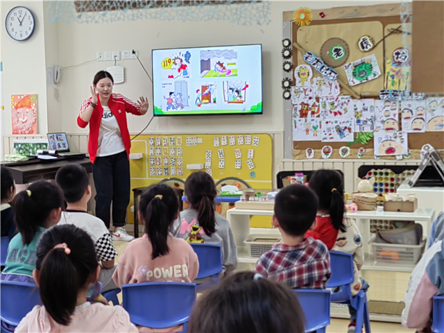 活动中,仇老师利用解救公主的情境,首先向幼儿讲解发生火灾后如何正确报告火警、如何逃生自救和辨识消防安全标识等火灾应急常识,并围绕灾害面前怎么保护自己,讲解防火的基本常识,以游戏竞赛的形式让幼儿掌握避险减灾的技巧。随后,教师通过播放消防动画引入消防小常识,再用简单通俗的语言讲解消防安全知识,并加入肢体语言教会小朋友们火场逃生要点。最后,教师还给幼儿讲解了灭火器的功能和使用方法。在教学现场,教师巧妙地运用现代化的教学手段,营造生动活泼的教学氛围,体现了民主、平等、合作的儿童本位,展现了教师对课程游戏化理念的实际运用。