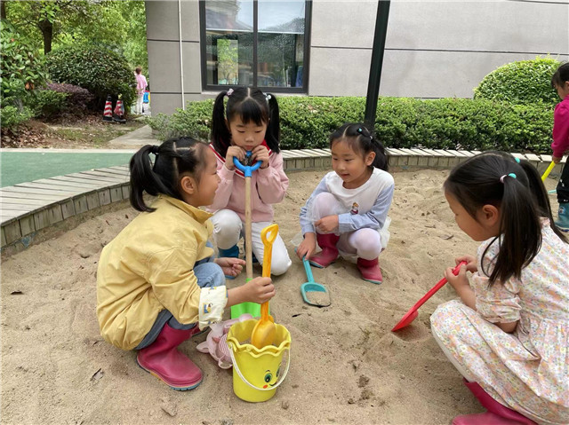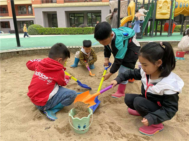 活动过程中,孩子们在一起讨论怎样搭建楼房,他们分工明确,有的用铲子挖沙、有的把沙拍平、……孩子们三个一群、两个一伙地拿着玩沙工具津津有味地建构着自己的乐园。孩子们用小桶、水壶、铲子、铁锹、模型、玩偶、漏斗等多种玩沙的辅助材料,通过自己的想象,进行着各种建构和构想。
